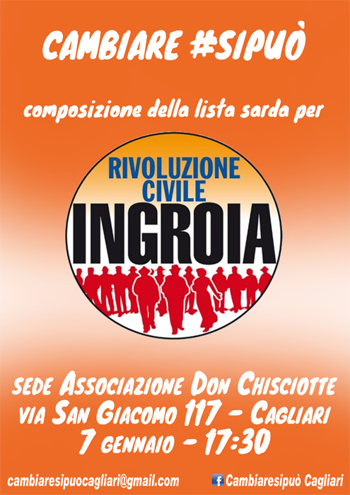 Lunedì 7 gennaio alle ore 17.30, presso la sede dell’Associazione Don Chisciotte in via San Giacomo 117, si terrà l’assemblea di Cambiare si può – Cagliari. All’ordine del giorno: Composizione della lista RIVOLUZIONE CIVILE- INGROIA in Sardegna