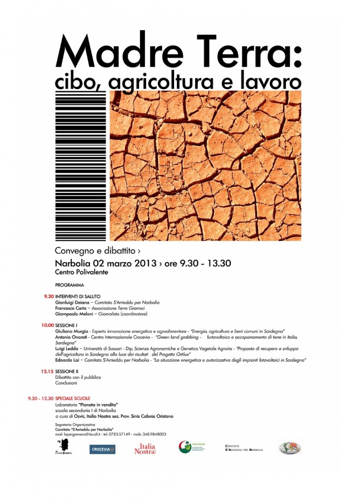 Probabilmente avete appena letto o sentito qualcosa sulle nostre più recenti attività, riportate da giornali o televisioni, riguardo alla brutta figura fatta dall’Assessore Regionale all’Agricoltura Oscar Cherchi con le sue bugie, ma non vogliamo parlarvi di questo. Vi scriviamo per comunicarvi che la mattina di sabato 2 marzo organizziamo a Narbolia, con inizio alle 9,30 presso il Centro Polivalente Comunale in Piazza Segni, un convengo dal titolo MADRE TERRA – Cibo, Agricoltura e Lavoro.