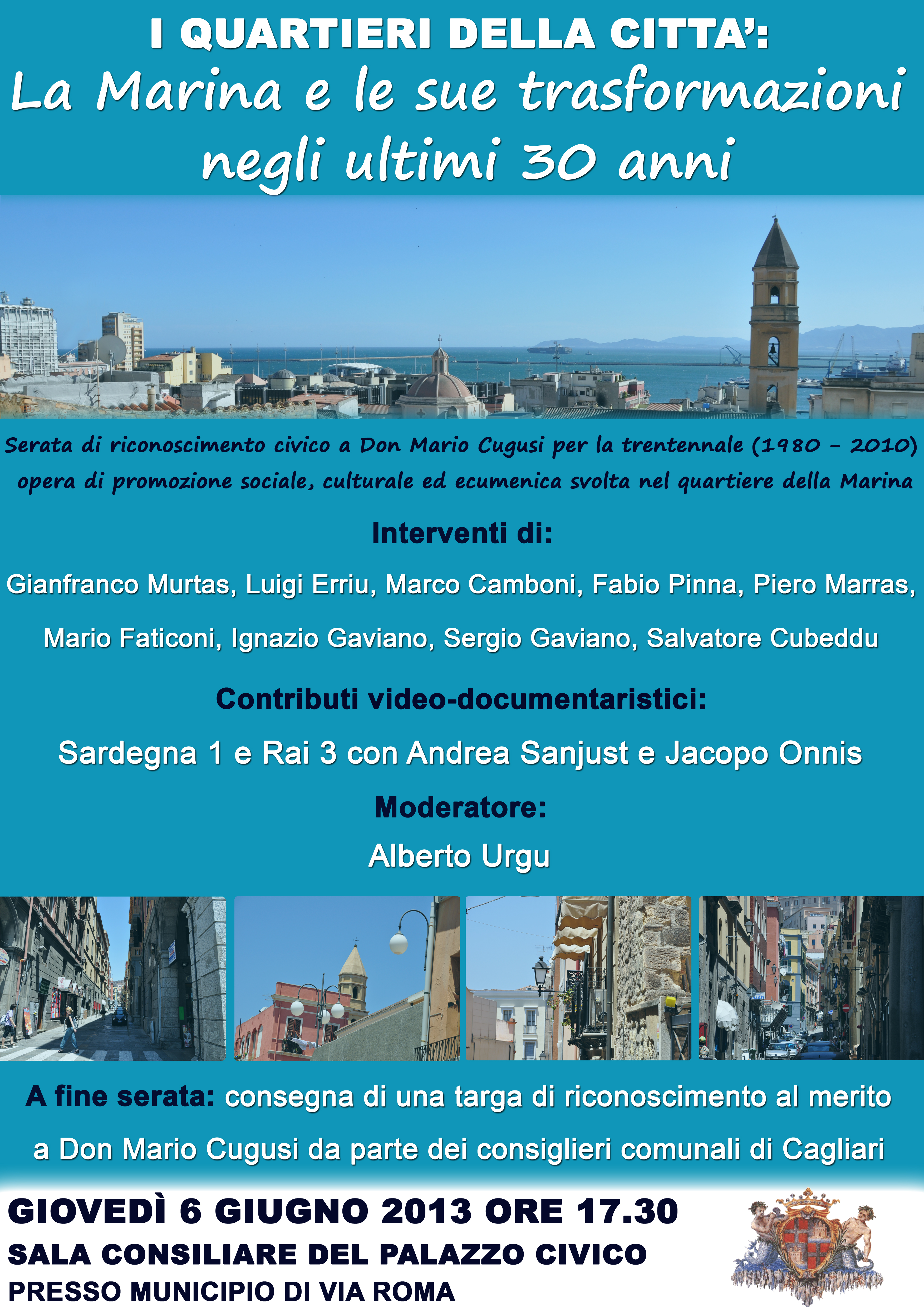 Per queste ragioni abbiamo pensato di strutturare una serata, da tenersi presso la sala consiliare del Comune di Cagliari, dal titolo “I quartieri della città: la Marina e le sue trasformazioni negli ultimi 30 anni – Serata di riconoscimento civico a don Mario Cugusi per la trentennale (1980-2010) opera di promozione sociale, culturale ed ecumenica svolta nel quartiere della Marina. Sono previsti diversi interventi di persone che hanno collaborato con don Mario in quei decenni, nonché la proiezione di alcuni video.